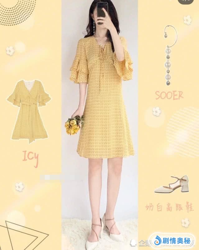 黄格子连衣裙。黄色格子很温柔,有一种清新感。超级适合度假,袖子的设计完美地藏住了大臂的拜拜肉,整体不是紧身款式但很显身形,裙子的长度也是刚好,显得腿很长,腿部比例非常完美。