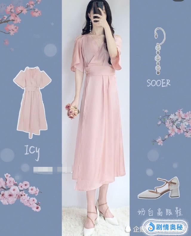 淡粉色长裙。这件淡粉色长裙看起来很温柔,腰部有个腰封可以收紧腰部,很显瘦。露肩V领可以让上半身看起来很纤细,长裙飘飘也很遮腿部的肉肉,垂坠感很棒,显得整体都很高。