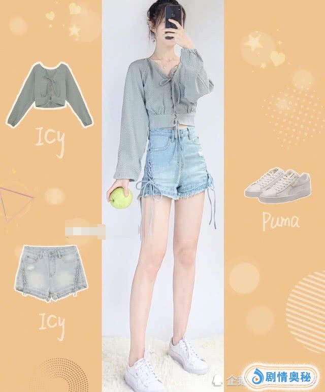 牛仔裤就是夏天的标配,这件短裤腰侧有绑带也很有设计感,日常穿或者度假穿都是可以的,上半身的格子长袖,腰部设计非常nice,自带收腰效果,短款上衣加上高腰短裤,瞬间变大长腿,一米七既视感。