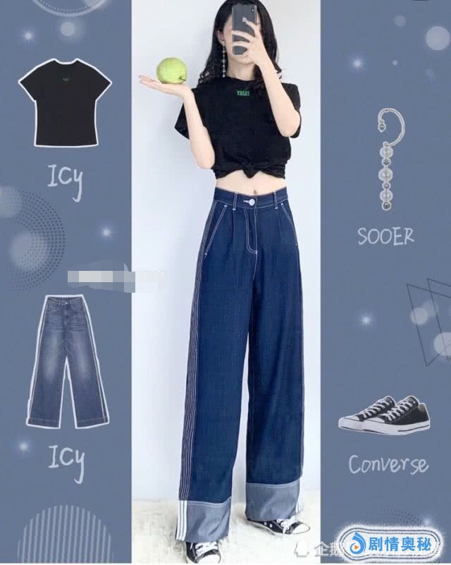 黑T配牛仔裤真的是很百搭,牛仔裤的材质是仿牛仔,布料在夏天也是很舒服的,版型超级好,很显腿长,更显的腿型很棒,很直,这一整套可甜可盐,夏天就应该这样穿。