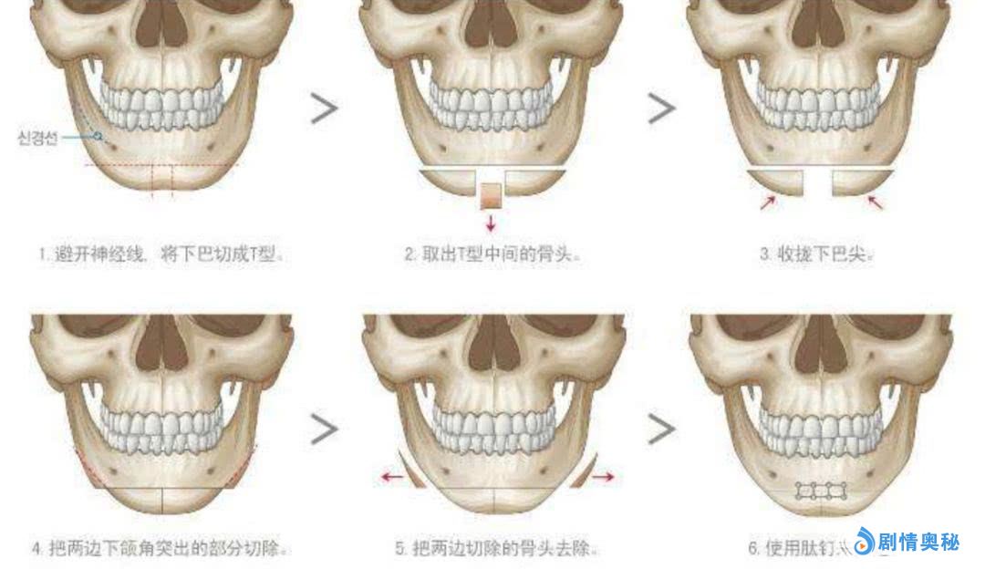 另一个V-line手术也是韩国轮廓项目的常客,目的就是为了进一步把正希的“大饼脸”变成“V字脸”,具体手术方法也是采用截骨的方式,先把下巴切成T字形,再取中间的骨头。