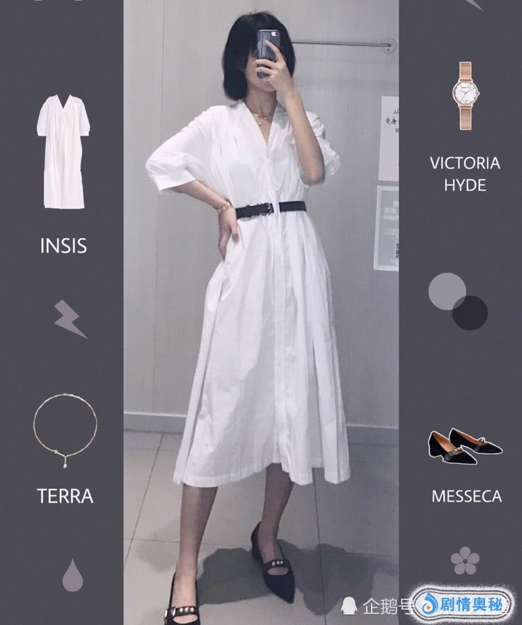 白色连衣裙+珍珠项链+黑色皮带+玛丽珍鞋。这件裙子非常的好看,很宽松的版型,加一条腰带,既凸显了腰线,有显腿很长,V领的设计带着点成熟的气质,一点都不挑人,上身都是很好看。