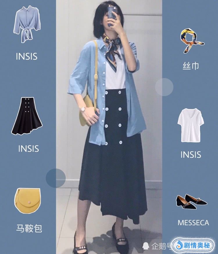 纯白色V领T恤+不规则半裙+雾霾蓝衬衫+小丝巾。白T恤和黑色半裙的组合能hold住很多的场合,这件半裙的不规则打破了原本的沉闷,再加上衬衫作外套,整个look既成熟又有点少女感,非常的简约百搭。