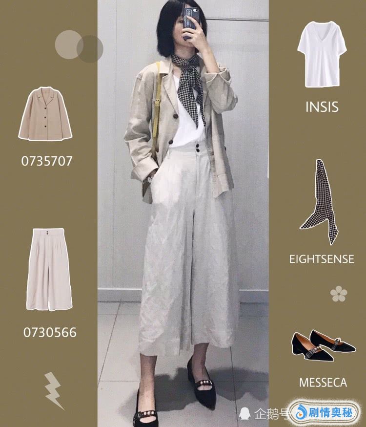 纯白色V领T恤+卡其色亚麻西装+米白色阔腿裤。这一整套的搭配真的是既温柔又霸气,浅色系看起来很舒服,这件T恤V领非常的低,觉得露的可以像图片上一样价格丝巾,显得很高级。