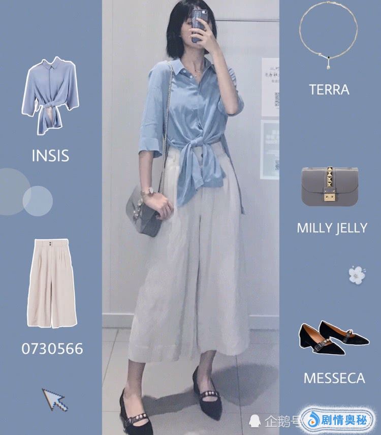 雾霾蓝衬衫+米白色阔腿裤。这件衬衫的颜色非常的美,而且设计感很独特,两边都是开口的,可以再前面系成个小结,搭配米白色的阔腿裤,既温柔又有气场,比黑色更加灵动。