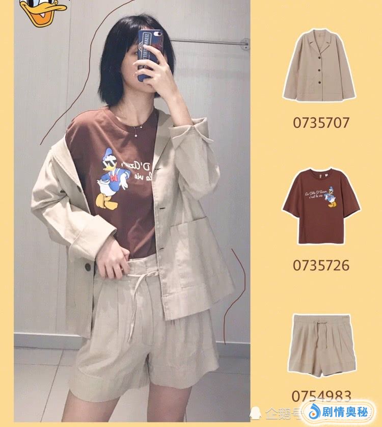 卡其色西装外套+唐老鸭T恤+亚麻短裤。这一套很适合刚入职场的女孩子,严肃的外表下藏着一颗可爱的心,西装外套也是大热的单品,很百搭,高腰的短裤显得腿很长,整体都会显高。