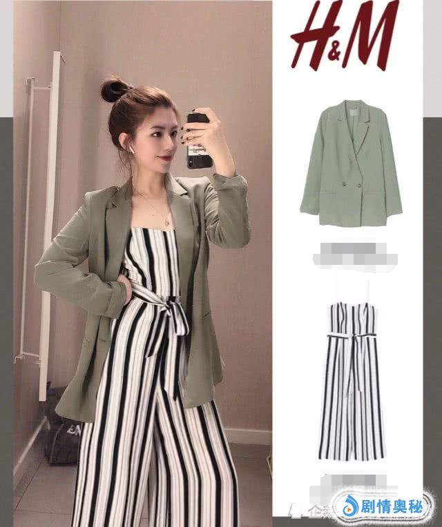 绿色休闲西装外套+抹胸条纹连体裤。这件条纹的连体裤上身非常有大牌的感觉,很有气质。再搭配上墨绿色西装外套,非常流行的搭配,外套刚好到屁股的长度,很显瘦。