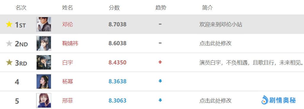 先看榜单前五名,目前位列第1~第5名的电视演员依次是邓伦、鞠婧祎、白宇、杨幂,以及邢菲,其中领衔主演《绅探》的白宇斩获季军,新生代小花鞠婧祎位居次席,与霍建华合作新剧《筑梦情缘》的杨幂下滑至第四名,位列第五的是主演《致我们暖暖的小时光》的邢菲,冠军是他,没错,他就是有新剧《封神演义》和新综艺《密室大逃脱》在播的邓伦。