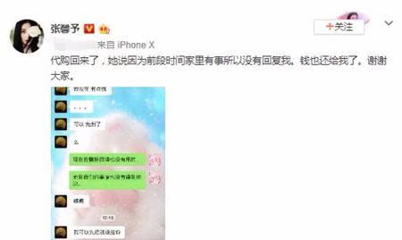 而张馨予发文不久,就引起了网警的跟进,提醒大家不要购买这些没有保障的东西,要在一些正规的平台去交易。一个小时之后,张馨予再度发文:“代购回来了,她说因为前段时间家里有事所以没有回复我。钱也还给我了。谢谢大家。”事情得到完美解决,失去的6900元钱又失而复得,也算是皆大欢喜,希望张馨予以后不要在发生类似的情况吧。