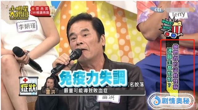 但可能因为长年累月的工作和生活压力,近日雷洪在节目上透露,自己前段时间在扫地时摸到树叶,导致手上长满了水泡,一度蔓延到全身,最后全身出现溃烂,手指甲也被感染至脱落,就医后,医生给出的诊断是由于自身免疫力失调,所幸就医即时,不然差一点就演变成败血症了。