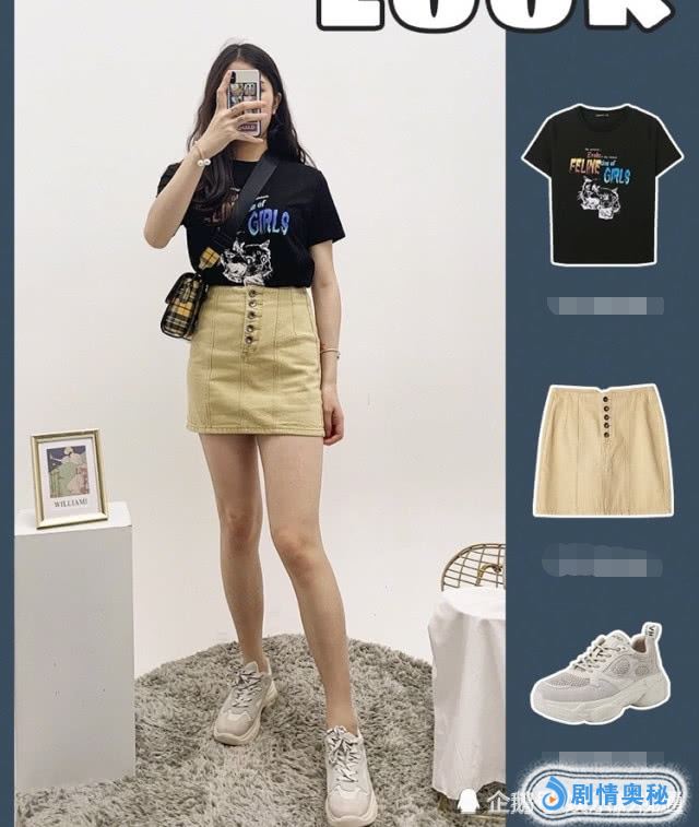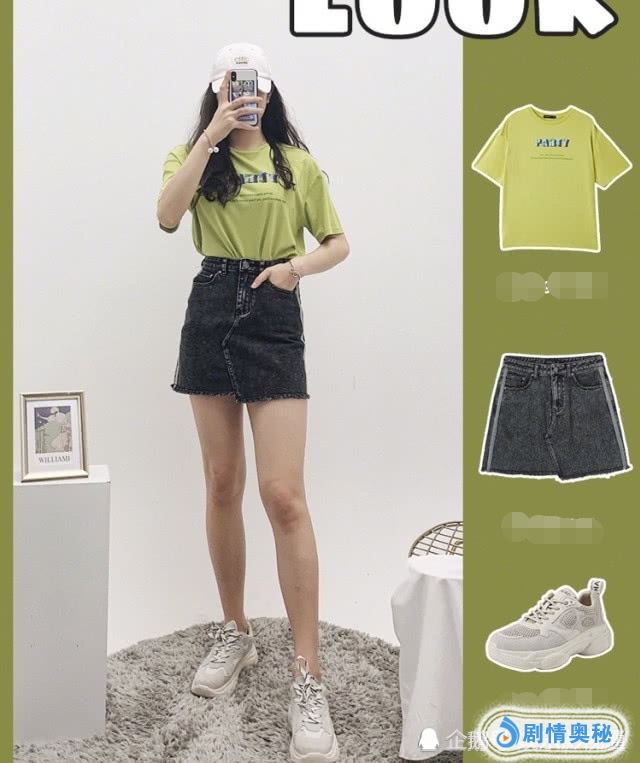 T恤+短裙。牛油果色在夏天是绝对的神仙色,非常的显白,一点都不会紧身,搭配一件牛仔短裙,裙子自带设计感,对于梨形身材的人非常的友好,很适合,把上衣扎进裙子里,很显腿长。