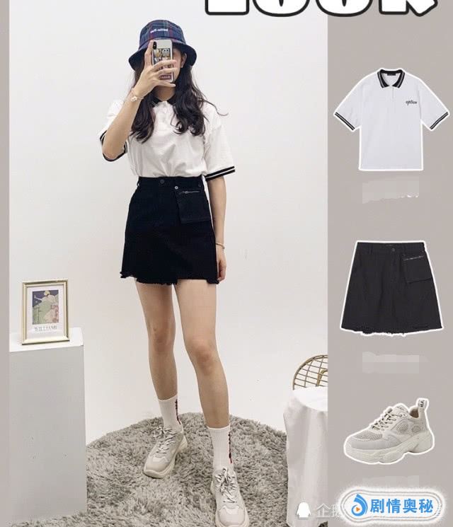 polo衫+短裙。日系小姐姐学院范,无论拼色polo衬衫,还是自带腰包的牛仔短裙都很有造型感。黑色配色更是经典的搭配,一点都不会过时,任何人都能驾驭。