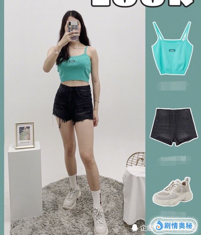 吊带+热裤。这样的搭配是很多人都喜欢的,不仅性感,更加的清凉。这件水蓝色的小吊带很可爱,超级的夺目,担心太暴露的可以搭配一件小外套,不仅遮肉还防晒。
