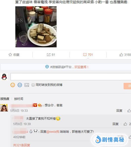 原来是郭碧婷的父亲,在微博晒出了一张照片,图片上面有一些郭爸爸买的卤味,旁边的高粱酒则是准女婿向佐所送,并表示小酌一番也别有乐趣。