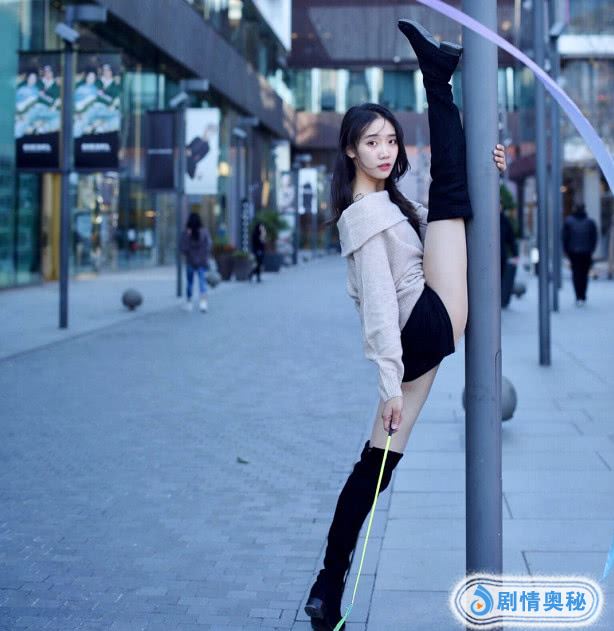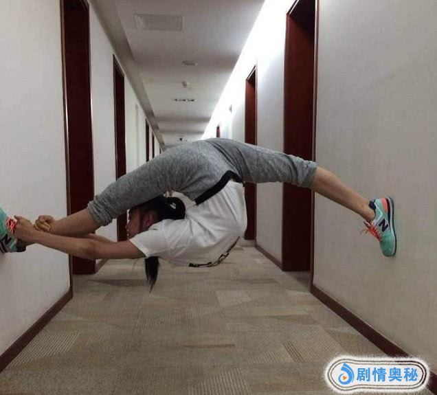 舒思瑶当中一个大家认可的一字马女神,也就是她图片当中这个动作,难度系数五颗星,展开一字马,但是中间部分架空,仅有两腿支撑点是碰到支撑体的。
