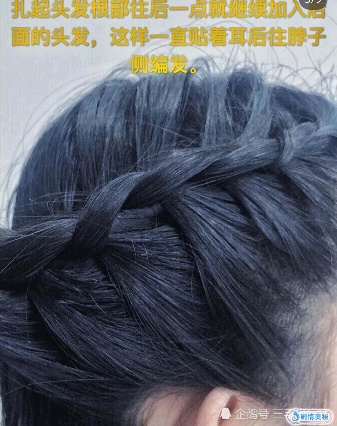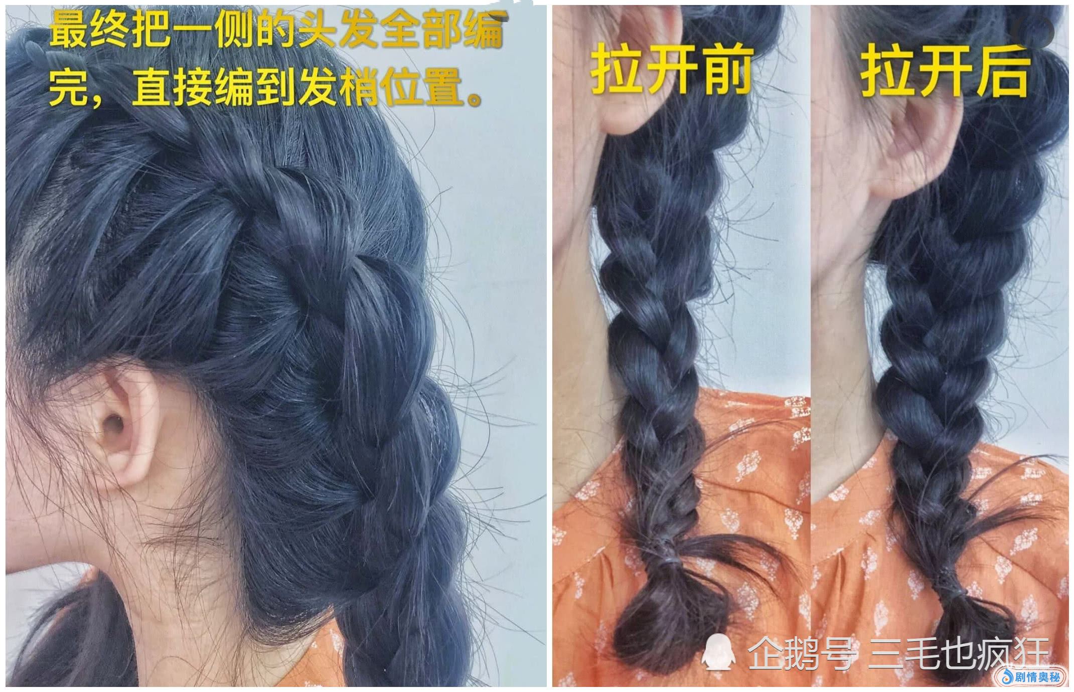 在扎起头发根部往后一点就继续加入后面的头发,这样一直贴着耳后往脖子侧编发,最终把一侧的头发全部编完,直接编到发梢位置。每新加入的一股头发要连着前面的头发抓在一起,两边步骤一样,扎上皮筋后,切记要把头发拉散哦,那样头发看起来更多,效果更好。