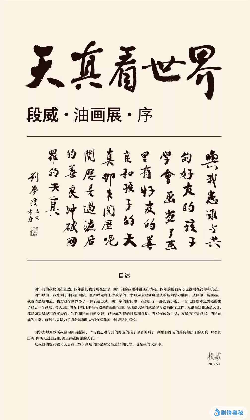 “天真看世界”。在编剧段威看来,这次像老友相聚一样的画展,热烈、充盈也简单、纯粹。