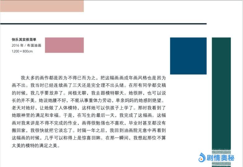 在一幅题为《快乐其实很简单》的人体写生故事卡上,她这样写到。而后,这个并不美丽的模特所讲的故事,最终给了段威推力,让她在最后一天,用“年画风”完成了这幅作品。
