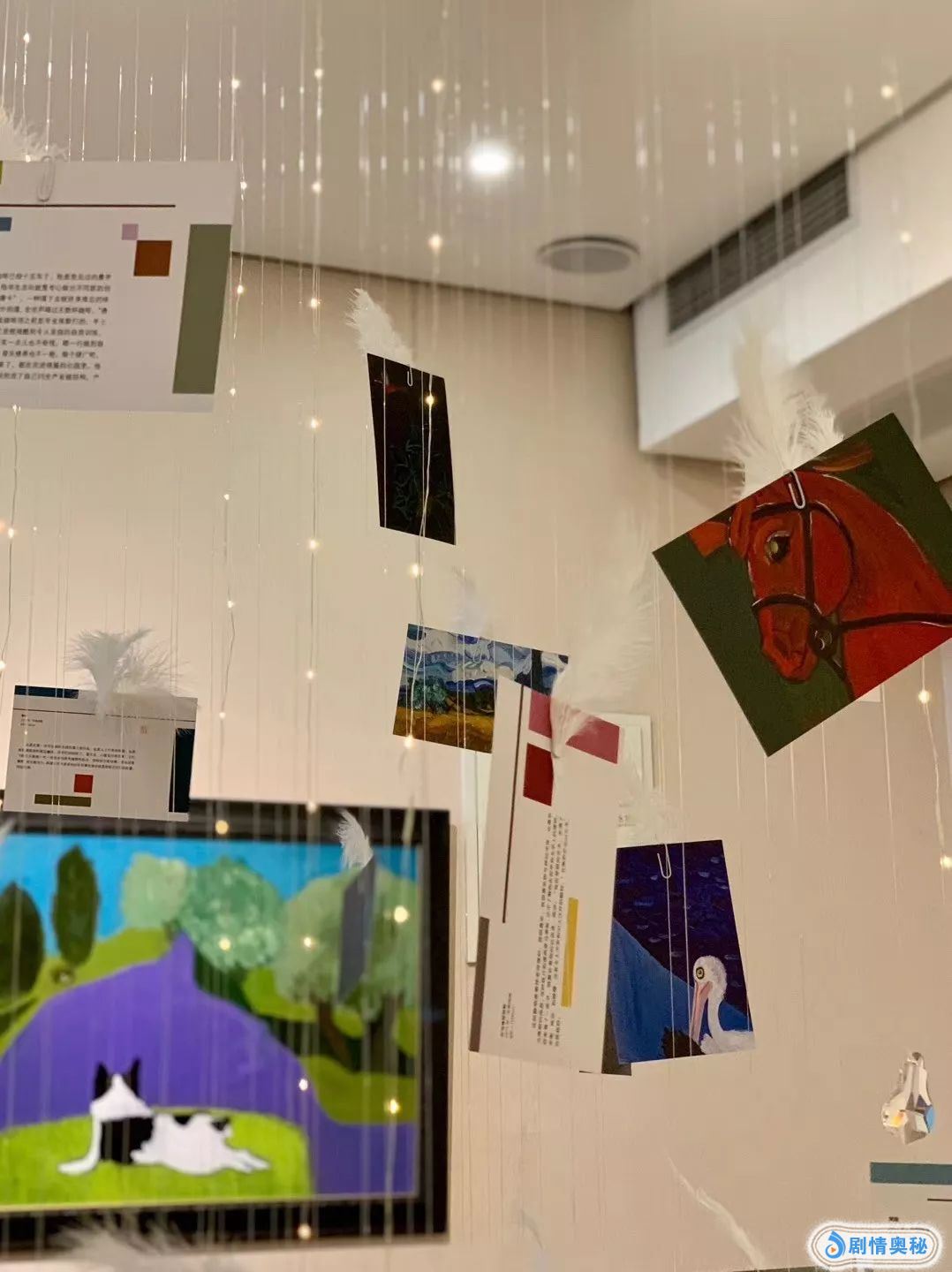 在“天真看世界”画展的中心区,有一组常规画展中从未出现过的装置——故事卡“瀑布”。顺着星灯“流淌”的故事卡签,正面是此次画展的重点画作,背后则是段威所写的绘画背后的故事。