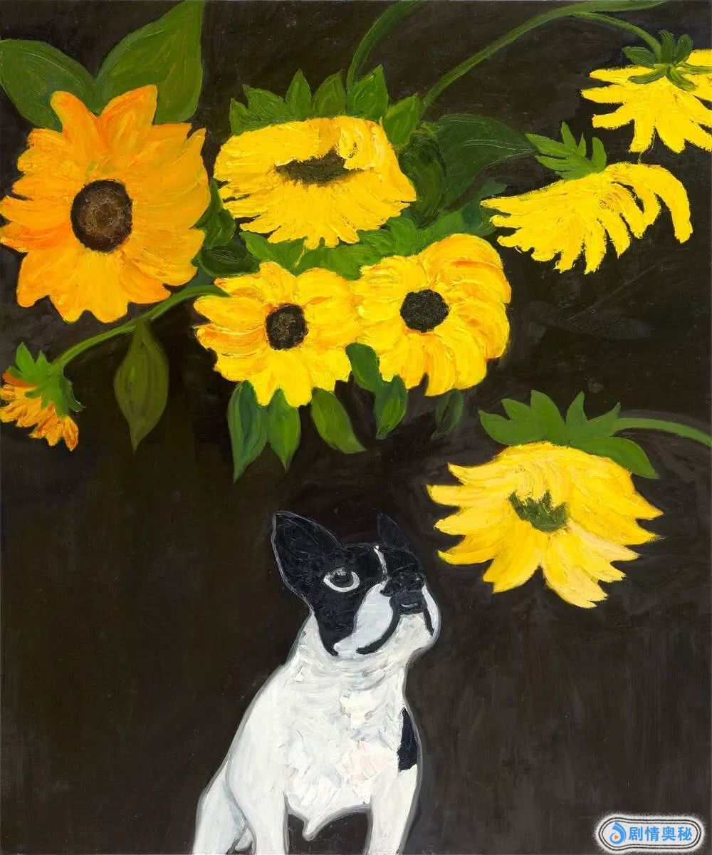 “画狗,我画得最快。在画《向日葵和牛牛》的时候,我感觉在抚摸它的毛。”在临展的前半个月,段威依然不曾停笔,想用一个大幅画为画展压阵,最终画出的便是一只在向日葵下抬头嗅闻的牛牛。