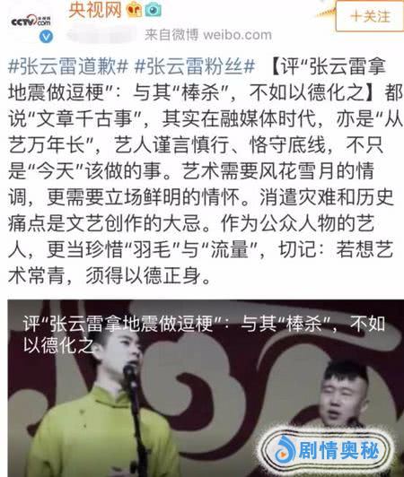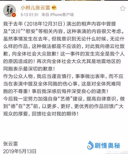 日前,德云社最炙手可热的青年相声演员张云雷身处舆论风口浪尖,被多家媒体点名批评无艺德,人民日报也报道了此次事件,引起外界诸多热议,不少网友认为,拿国殇做梗说相声,实在不应该,除此之外,张云雷还被扒出,早在2014年就拿汶川地震和慰安妇题材作梗,第一次表演这样的节目也并非自己所说的2018年底,而在凌晨,张云雷发声道歉:认识到自己的错误,向德云社和公众道歉,良心受到谴责。