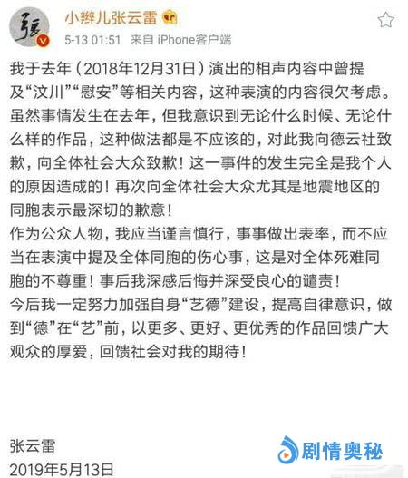 日前,张云雷因在自己相声作品中调侃国殇而引起外界诸多热议,拿汶川地震做梗,台上说相声,受到诸多官媒的批评和喊话,13日凌晨,张云雷发布致歉信,向德云社和公众道歉,称自己良心受到谴责。再度引起广大网友的热议,很多粉丝支持张云雷,知错能改,善莫大焉,不过也有网友认为,错了就要为自己的错误复出代价,别以为一个道歉就能够解决所有问题。