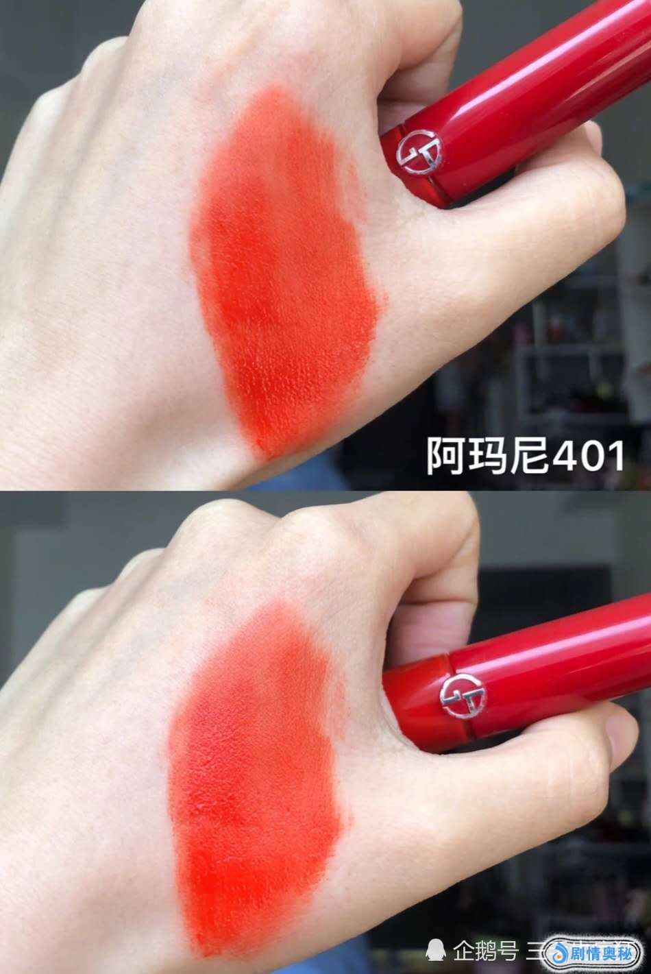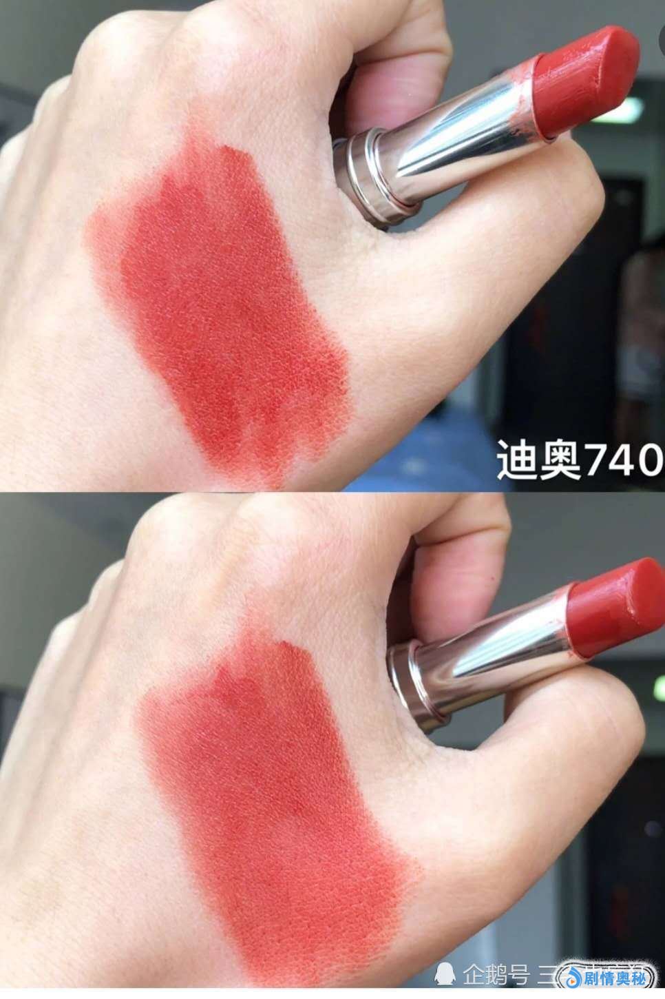 首先第一支是迪奥704,偏棕调的番茄红,不是那种很深的砖红色,很多人都是适合秋冬,但是其实它非常的百搭。夏天涂也是非常的好看。第二款是阿玛尼401,活力四射的橘红色,上嘴元气满满,超级的显白。