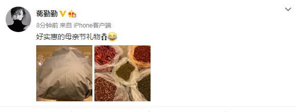 而对于这样一份与众不同的母亲节礼物,蒋勤勤也附文表示:“好实惠的母亲节礼物。”文末还不忘附上一个笑哭的表情,看来也是在她的意料之外了。