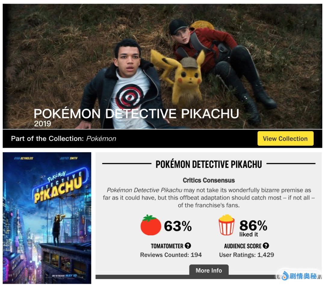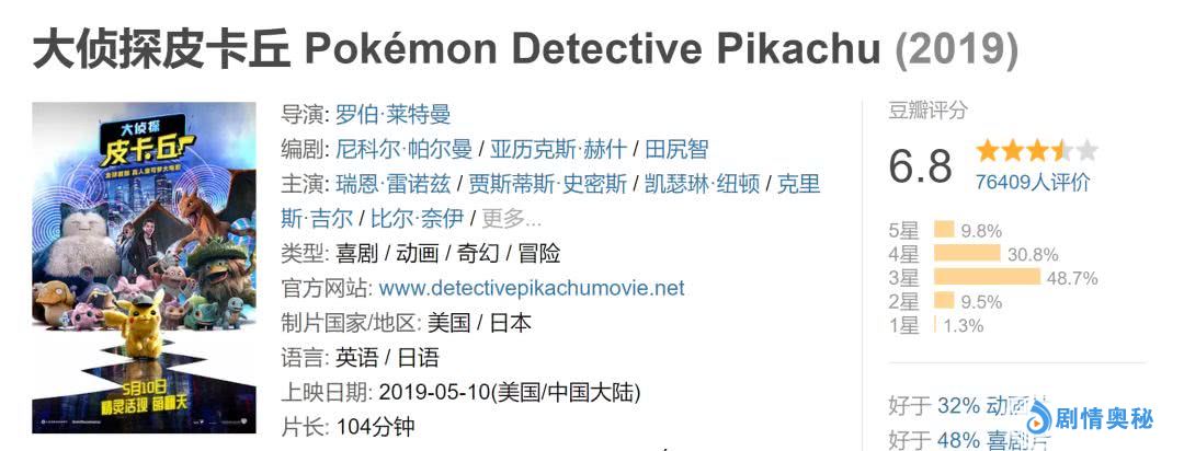 《大侦探皮卡丘》的豆瓣评分为6.8,烂番茄新鲜度63%,爆米花86%,北美票房目前为5800万美元。作为一部好莱坞改编的日本IP电影,对比以往的例子来看,这个成绩并不算差。