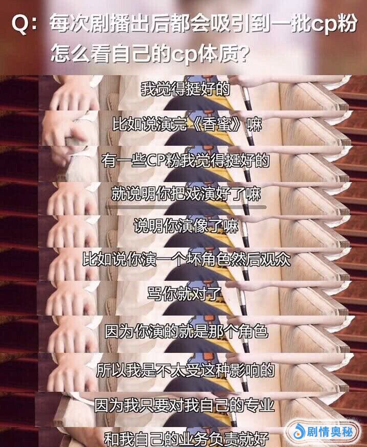所以,剧中cp是可以理解的,也是可以接受的,毕竟,角色是角色。可是真人cp就让人有点难以接受了,曾经圈中也有很多热火朝天的cp艺人,可是到最后该嫁给谁还是嫁给谁了,她们有自己的恋情啊,不能够看粉丝怎么想就怎么去做。cp粉还是应该要谨慎,真人cp大部分都是没有好结果,并且不会长久的。