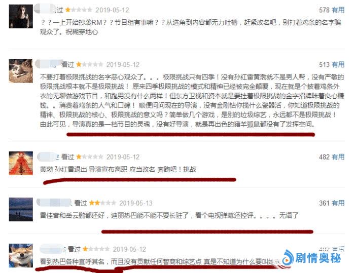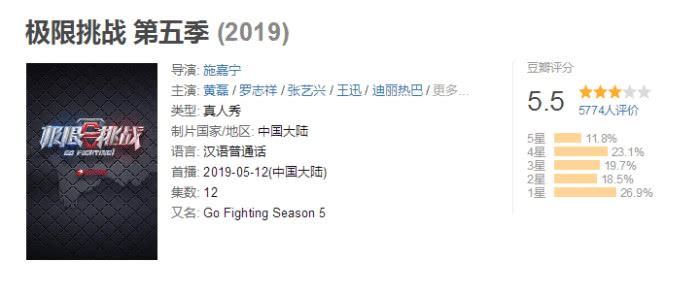 《极限挑战5》首播后收视率大获全胜,网播量也轻松破亿。不少网友都是冲着男人帮四人组而来了,也有网友期待迪丽热巴、雷佳音和岳云鹏三位新成员的表现。但是《极限挑战5》虽然赢了收视,却输了口碑。首播后《极限挑战5》的豆瓣评分下滑到了5.5分,比起第一季豆瓣9.1分、第二季豆瓣9.2分、第三季的8.2分,还有第四季7.6分。对于《极限挑战5》半数网友给了一星差评。