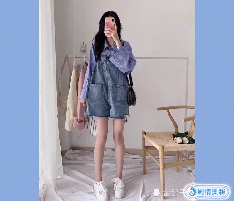 条纹衬衫+牛仔背带裤。这件蓝色的条纹衬衫,非常的宽松,可正式也可休闲,料子非常的清爽,一点都不会闷热,搭配这件背带裤,非常的减龄,裤子非常的饿显腿细又显腿长的版型,整体是非常的可爱。