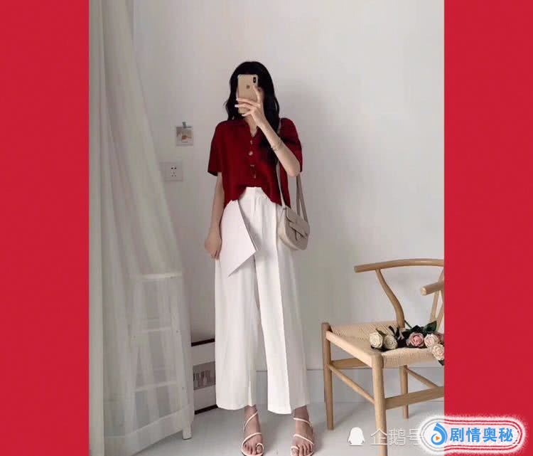 针织短袖+阔腿裤。这一整套的搭配就是上班族的首选,非常的职业风,穿上立马一米八的大气场,这件红色短袖,非常的正,很显白,搭配这件白色阔腿裤,妥妥的大长腿,而且很显瘦。