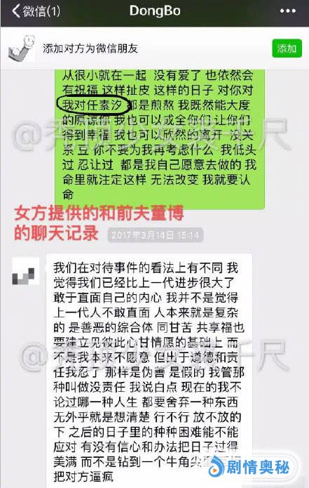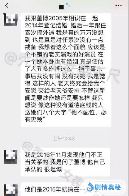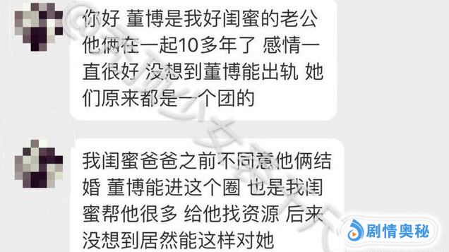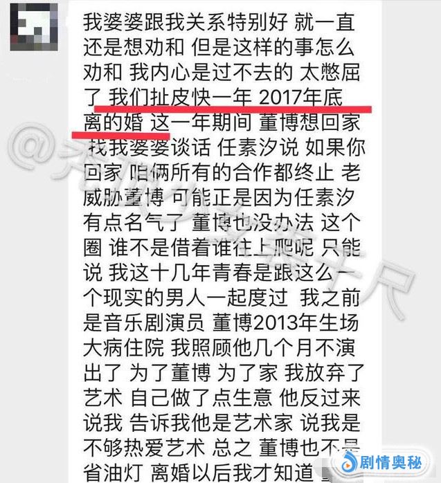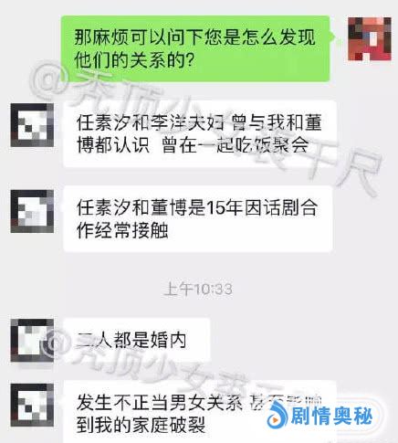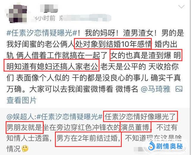 在媒体曝光任素汐和董博恋情后,一位自称是马琦雅闺蜜的网友,先是转发了“曝光任素汐和董博事件”媒体的帖子,还配文“渣男渣女”。并且私下里向媒体爆料了很多细节的东西。任素汐和董博因工作原因走在一起,他们发生恋情时,董博和马琦雅刚结婚后不久。因为任素汐的插足,董博自己都承认了,导致董博和马琦雅离婚。