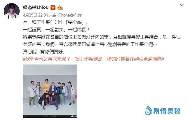 其实这已经不是修杰楷第一次表白自己的合作伙伴了,在此之前修杰楷就曾发博称赞过这次的合作伙伴让自己觉得很有安全感,大家一起成长欢笑是一件很美好的事情。