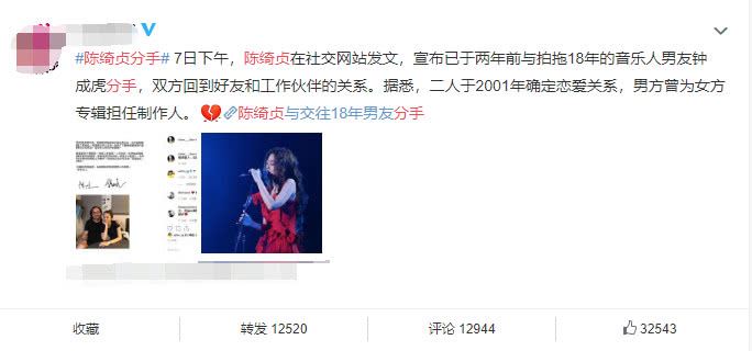 陈绮贞其实这些年来一直在和音乐人钟成虎在谈恋爱。两人感情的开始是在2001年的,不过谈了这么久的恋爱也迟迟不见宣布结婚的消息。就在近日,网友曝出陈绮贞在某社交网站上面发文说自己早已和男友在两年前结束了恋爱,也算是和平分手所以现在就从恋人的关系变成了挚友的关系了!