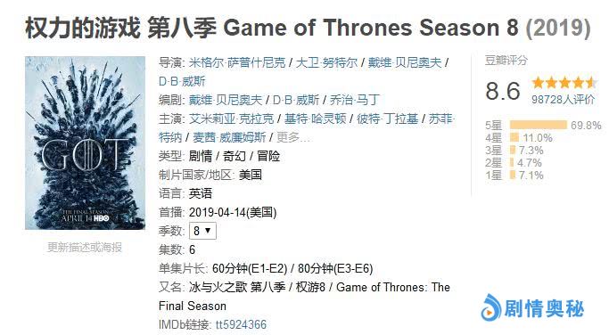 这或许是由于戴维·贝尼奥和D.B.维斯两位编剧在第六季接手时,《权力的游戏》便在一定程度上离开了原著《冰与火之歌》。