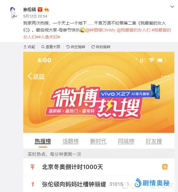 说是张伦硕作秀倒也是不太可能的,谁会把自己的不好的一面做出来呢?可见综艺也不都是有剧本的,都是他们两个夫妻俩的家务事,钟丽缇和张伦硕姐弟恋,而且钟丽缇这次也是三婚了,看的出她真的很珍惜这得来不易的家庭。张伦硕也发文向钟丽缇道歉,还指出了自己家的两次热搜,一次天上一次地下。