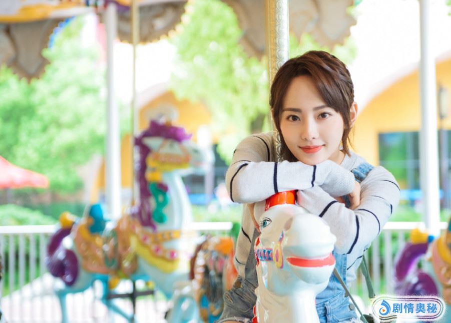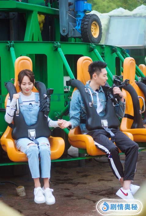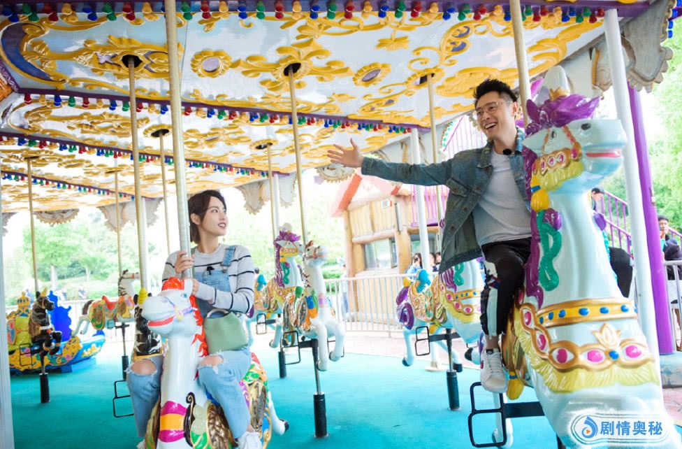 坐在旋转木马上的两个人,一手扶着木马,一手做出飞翔状的买超开心的像个大男孩一样,而一旁张嘉倪则化身为老公小迷妹,一脸深情地看向她。