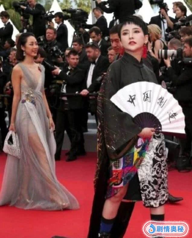 除了这些明星大咖,戛纳红毯这两年也成了不少中国网红博关注的战场。这一次当然也不例外。这些人有的穿的奇形怪状,有的长相对不起观众,还有的故意搞事情以博得关注。比如这位网红,穿的花里花哨,手里的扇子上还写着“中国制造”,一脸的不屑。