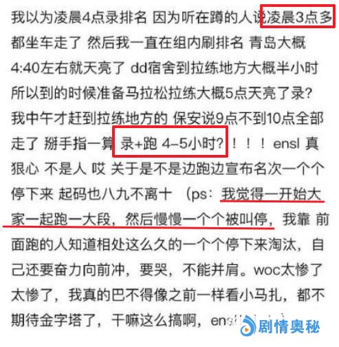 从网友的爆料来看,这次创造营的录制,竟然是在晚上,凌晨三点多起来录节目,对于学员们的身体是一个很大的折磨,本来练习就很辛苦,这样下来更受不了,而且这次的排名竟然采用的是马拉松的形式,学员们从同一起点开始出发,在这一过程中,陆续有学员被叫停,说明他们止步于此,而第一名的周震南才是最让人担心的,无疑是跑完全程的一个人,还有网友贴出照片,周震南在跑完以后眼睛通红,没有休息好的缘故加上大量的运动,这档节目也看的网友非常的生气!