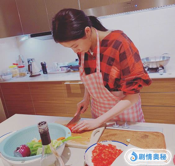 这是关晓彤在自己家厨房切菜的模样,戴上了围裙,衣袖全部挽起来,细嫩的小手在切菜的时候十分小心翼翼。桌子上还摆着切好的西红柿丁,大小都很均匀,看来刀工还不错。