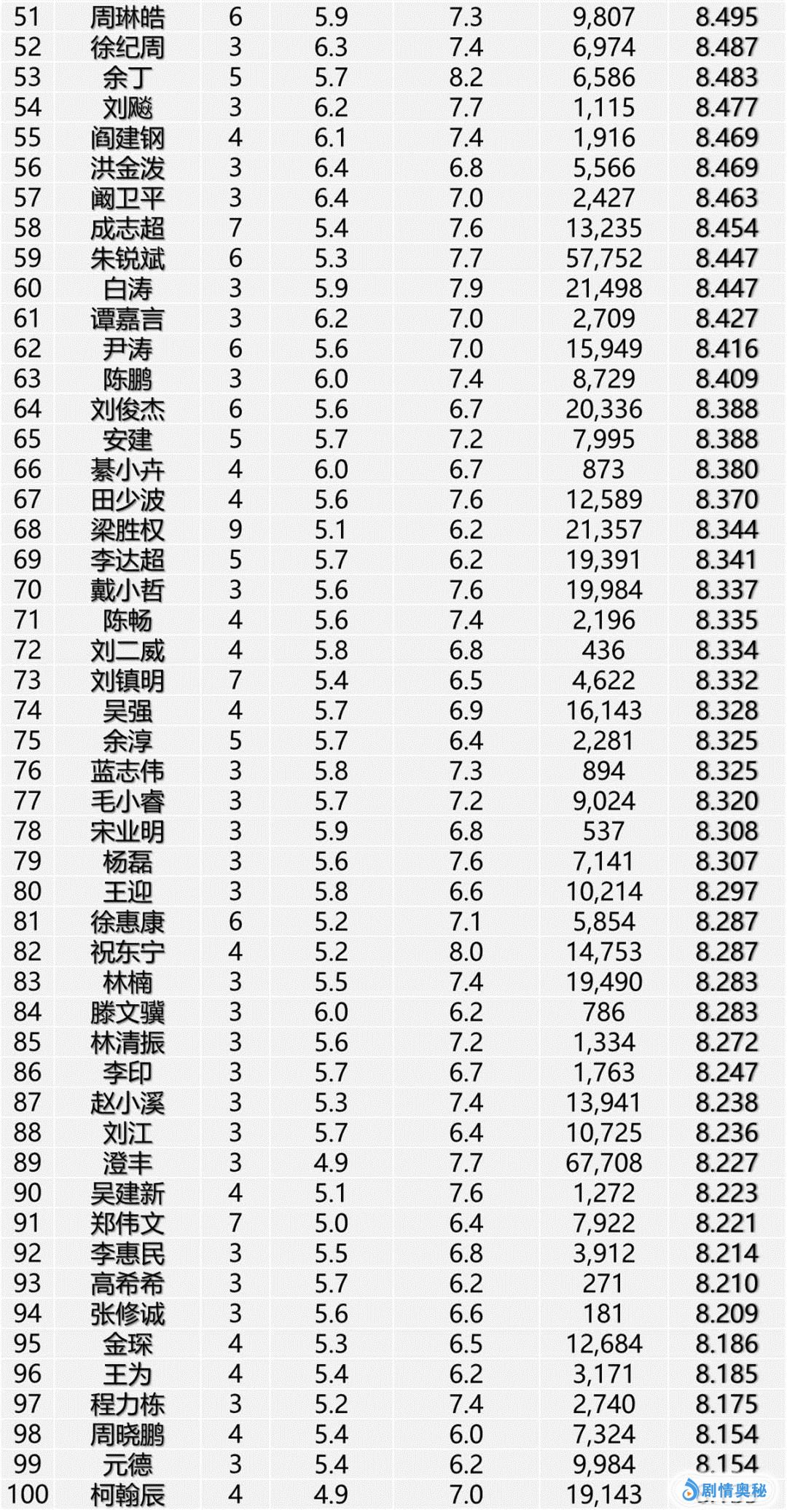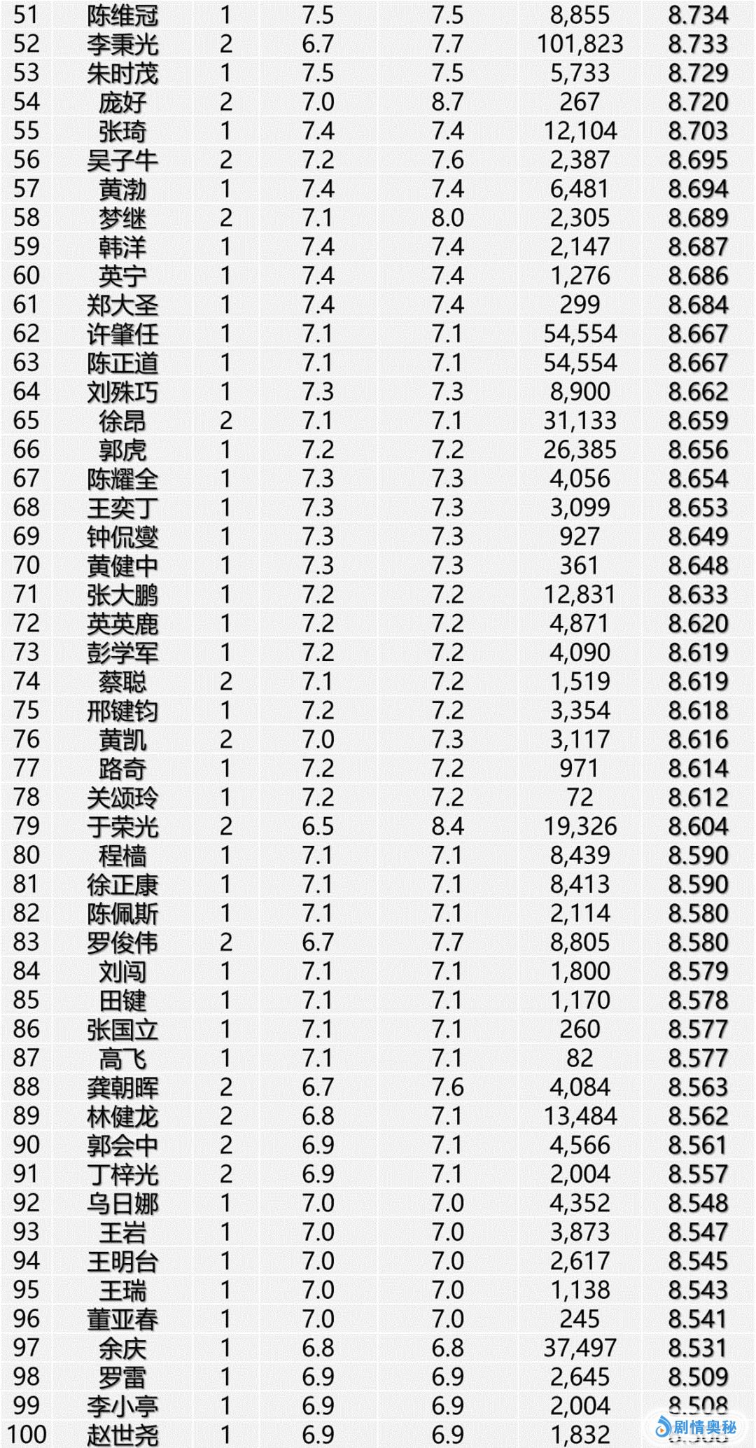 上述罗列的是近五年参与作品超过3部的导演排名,小V还一并整理了最近五年执导1-2部的导演口碑Top100以供参考:
