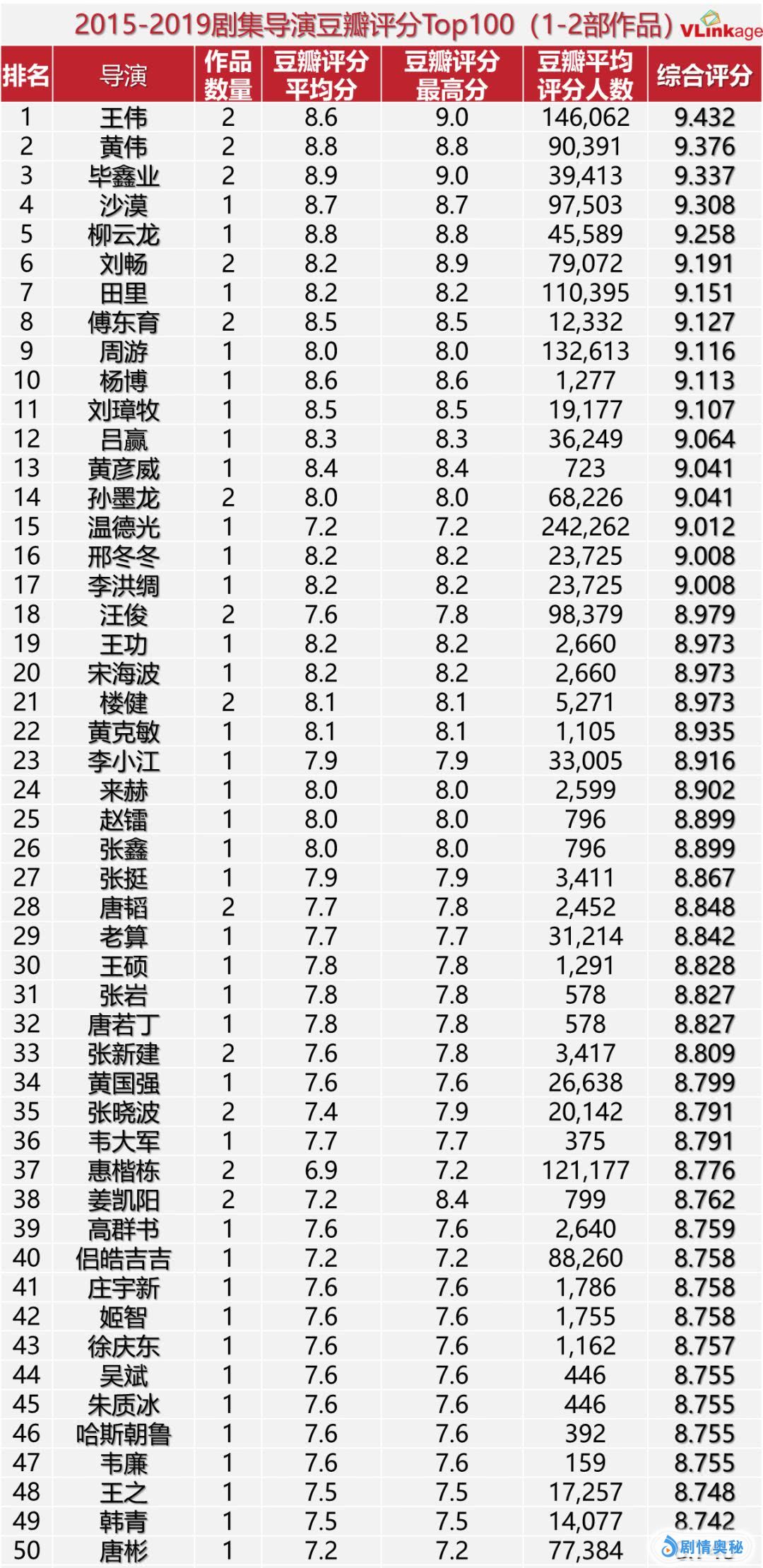 今天小V整理了近五年导演的豆瓣数据,得到2015-2019年剧集导演豆瓣评分Top100,让我们一起来看看哪些剧集导演的豆瓣成绩最好。
