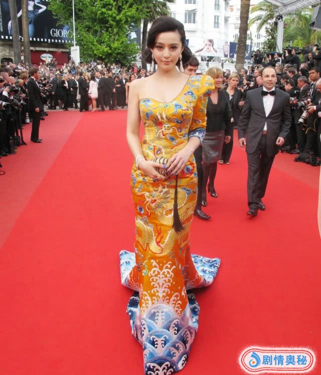 2010年,第63届戛纳电影节,范冰冰一袭黄色龙袍造型亮相红毯,吸引了当时现场记者无数的镜头。