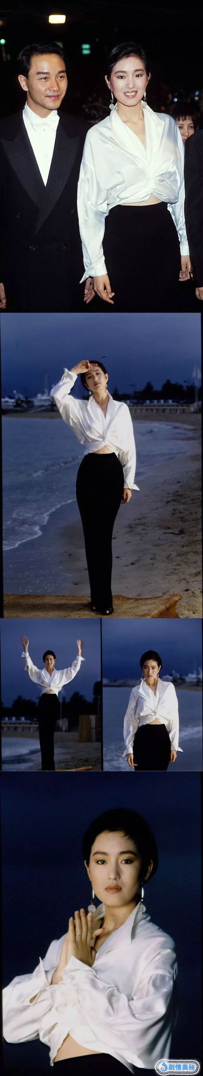 1993年,巩俐穿一件白衬衫配包臀裙,和张国荣亮相戛纳时,这个造型登上了当年的时尚刊版面。在海边那极具风情的一瞥,成为了巩俐的经典造型之一。