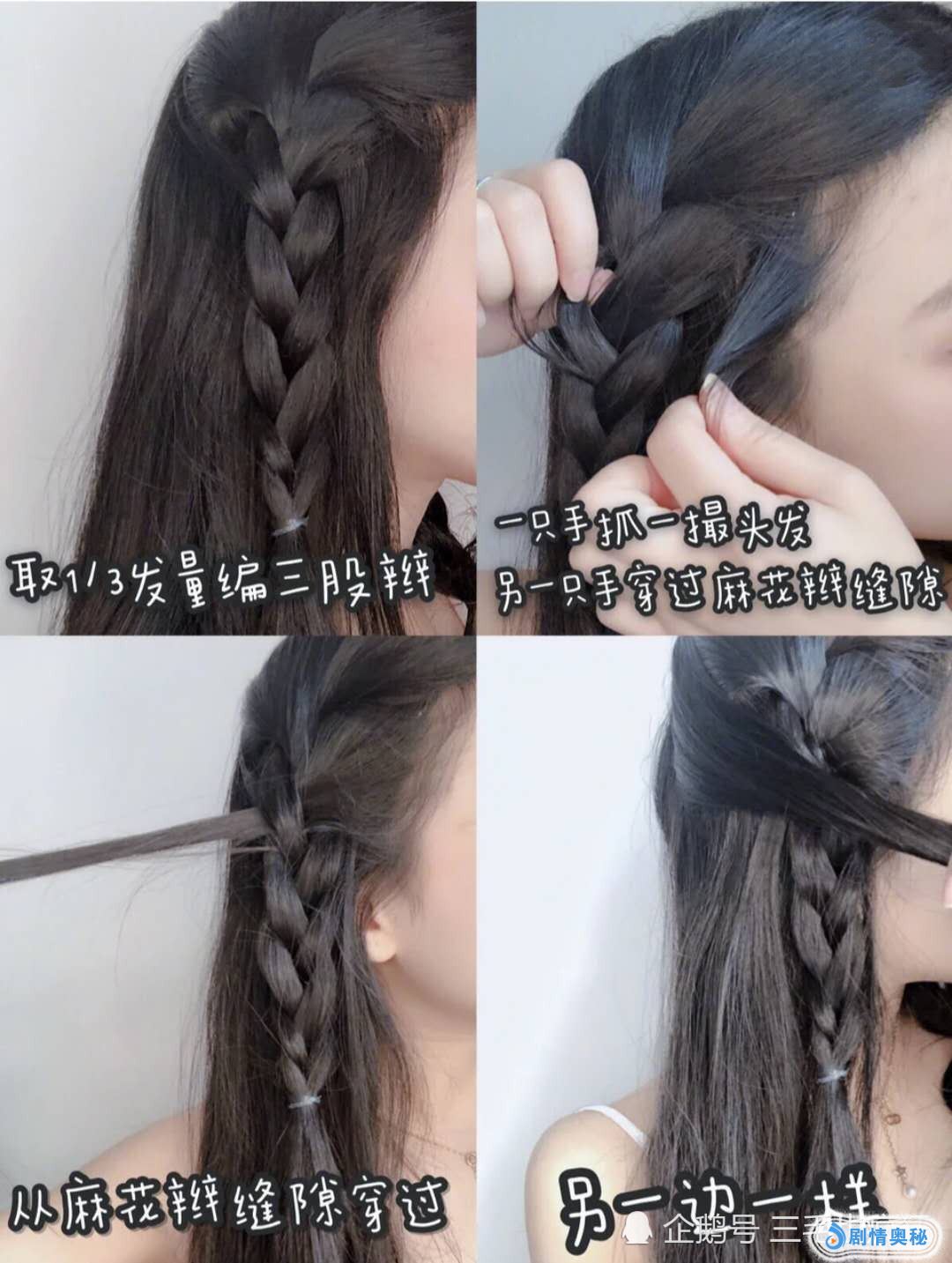 首先将头发从中间分为两块,从一侧取1/3的发量编三股辫(就是最简单麻花辫),编至下颚处,再拿小皮筋固定。之后一只手穿过麻花辫的缝隙,同时另一只手从对侧抓取一撮头发穿过麻花辫缝隙。另一侧采用相同方法编发,交叉编。最后4至耳下方大家会发现所有头发都在一起啦,这时候再将所有头发分为三股,麻花辫的方法编完。