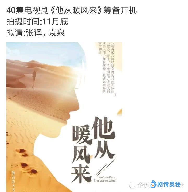最近有一部新剧正在筹备当中,那就是《他从暖风来》了。这部剧是现代题材的作品,女主的设定是气场两米八的职场女魔头,男主的设定是铁骨铮铮的“蓝盔”战士,看到这个人物设定,大家是不是有点小期待呢?