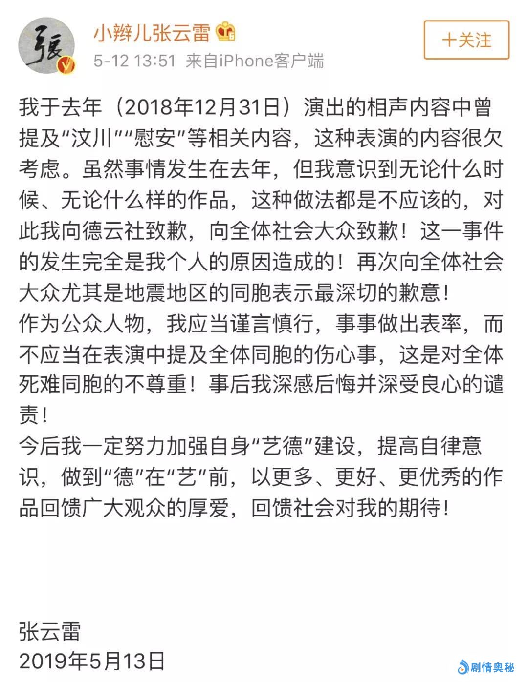 像许多公众人物、明星,对于汶川的5.12大地震都是怀着敬重的心去缅怀逝者,到了张云雷这儿却拿来说相声取乐,是不是很过分。等到事情发酵了之后,虽然张云雷也道了歉,但是许多路人对于他的道歉都不太能接受,觉得无论怎样都不能拿灾情开玩笑。