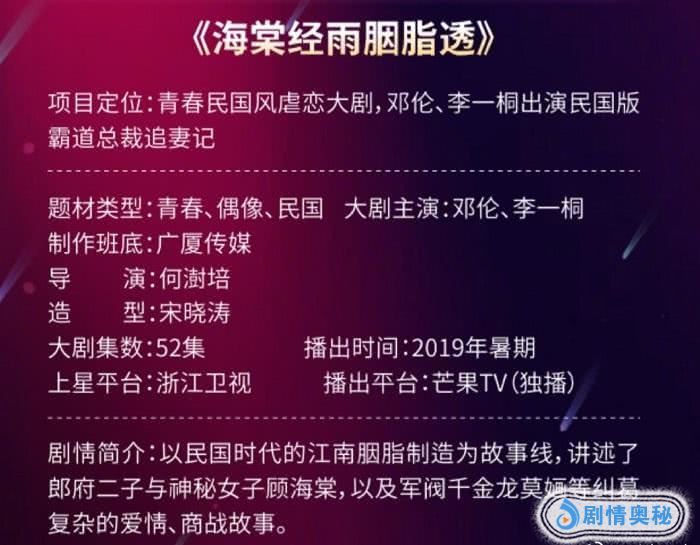 《海棠经雨胭脂透》这部剧其实早就该播了,在2年前就已经拍好了,而那个时候邓伦还没有演《香蜜》呢。讲述的是民国时代的故事,顾家两兄弟是如何在乱世中克服种种阻碍,最后团结一致,将民族品牌“罗里春”发展壮大的。